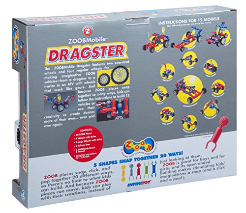 -. Binding : Toy -. Brand : ZOOB -. EAN : 0635694120545 -. Feature : 50 pieces to start your engines / Extra large wheels to build a hot rod / Kids can follow guides or use their imaginations to create their own vehicles / Includes ZOOB pieces in unique racing colors, 4 wheels, axels and tires, 2 oversize wheels, 1 ZOOB Dude driver head with helmet and 3 instruction guides / Recommended for children 6 years of age and older -. IsAdultProduct : 0 -. IsAutographed : 0 -. IsMemorabilia : 0 -. ItemPartNumber : 9054 -. Label : Zoob -. Manufacturer : Zoob -. Model : 0Z12054 -. MPN : 9054 -. PackageQuantity : 1 -. PartNumber : 9054 -. ProductGroup : Toy -. ProductTypeName : TOYS_AND_GAMES -. Publisher : Zoob -. SKU : LV-HGLL-DA6F -. Studio : Zoob -. Title : ZOOB Dragster -. UPC : 799783508543 -. Warranty : Against manufacturing defects