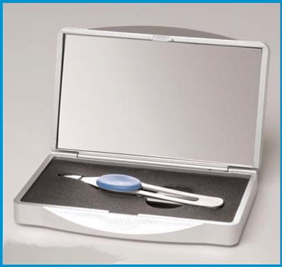 8x distortion free DFP glass. Elegant case with insert holds. Unique stainless steel tweezers with slanted tip to grab even the finest hair. Comfort grip pads aid in dexterity. Use for eyebrow tweezing, facial hair removal, makeup application and contact lenses. Made from plastic and glass. Silver finish. No assembly required. 5 in. W x 3 in. H (1lbs.) 8x Magnifying Mirror is built into an attractive silver colored travel size compact. Tweezers and mirror inside one case means tweezing eyebrows is always going to be an easy chore no matter where you are. Carry in your purse and travel with it!Feature
