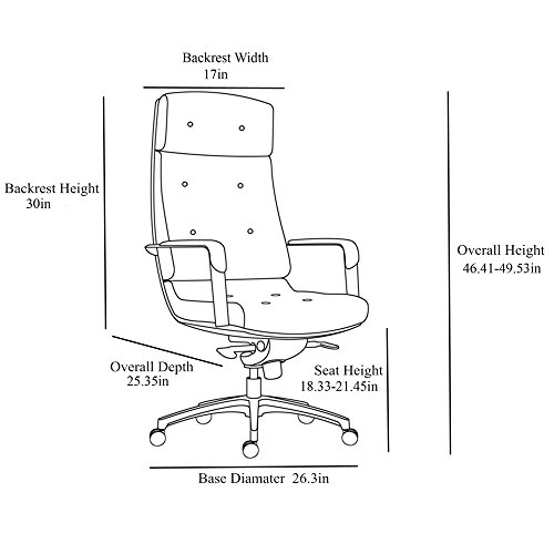 -. Binding : Office Product -. Brand : Zuri Furniture -. Feature : 25.35"(W) x 25.35"(D) x 46.41-49.53"(H); Seat (W) 17" Seat (D) 20" Seat Back (H) 30" / Adjustable Height: 18.33-21.45" / Padded Armrest, Aluminum Base, and PU Castors / Multi Function Mechanism with 4 Position Lock and Chrome Gas Lift. -. Label : Zuri Furniture -. Manufacturer : Zuri Furniture -. PackageQuantity : 1 -. ProductGroup : Office Product -. ProductTypeName : OFFICE_PRODUCTS -. Publisher : Zuri Furniture -. Studio : Zuri Furniture -. Title : Perot Genuine Leather Aluminum Base High Back Executive Chair