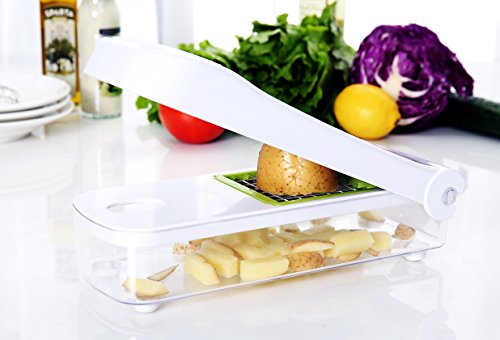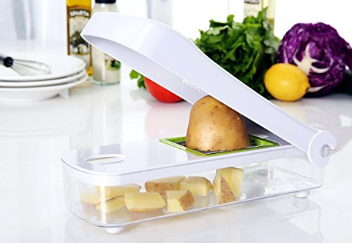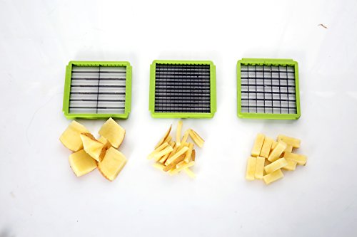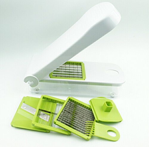 Product Description Try out our revolutionary cutting and dicing set for working smartly in the kitchen to save time and effort while getting the perfectly chopped vegetables and fruits and even cheese. The dicer set has been made with the premium quality rust resistant and heavy-duty stainless steel to provide a durable and effortless means of cutting. It helps to wind up all your cutting jobs in no time without creating any mess. The set includes 4 interchangeable blades that can provide thin, thick and large cuts as well as a slicing blade. It also includes a food container which has non-slip foot to provide a mess-free and odorless cutting and clean-up. The hand guarding tool helps to keep your hand safe while cutting with the blades. Moreover, the cleaning tool and the detachable assembly ensure that all parts of the set remain clean and hygienic. So, what are you waiting for? Get your dicing set today with 100% satisfaction guarantee and revolutionize your vegetable and fruit cutting routine. 0