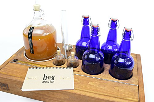 Studio : Box Brew Kits Publisher : Box Brew Kits Product Description Our popular "QuarterMaster" beer making kit is a great option for beginner and veteran brewers alike who have limited space and an eye for design. This kit measures 25"x14", and boasts a large hinged compartment for any extra accessories. A compact design provides everything you need to brew - and bottle - 1 gallon of beer. Each of the four re-usable cobalt blue quart-size bottles is perfect for sharing. A full set of instructions and recipes are provided. Parts included: Box Brew Kit 1-gallon base, handcrafted from rustic pine. One 1-gallon glass fermenter 4 reusable 1-quart cobalt blue flip-top bottles (no need for capping) Triple-scale hydrometer with glass test jar (and stand), for measuring alcohol content Auto-siphon, for quickly and easily transferring your beer between vessels 2" Stainless Steel Funnel Drilled rubber stopper 3-piece plastic airlock Laboratory thermometer 2 Miscellaneous glass jars (for extra ingredients, sanitizer, etc.) 3' length of 5/16" tubing, for siphoning your beer Recipe Book with over 25 recipes to choose from Brewers' Log Full set of instructions A large stockpot will be needed for the brewing process - brewing pots are not included in our kits as most folks already have a suitable pot at home! Recipe packs are NOT included and are available for separate purchase. 0
