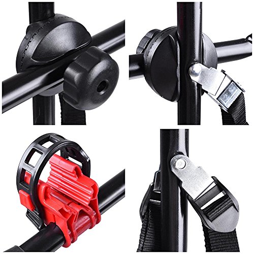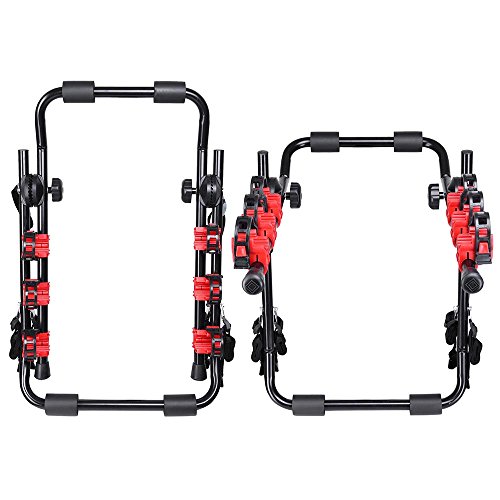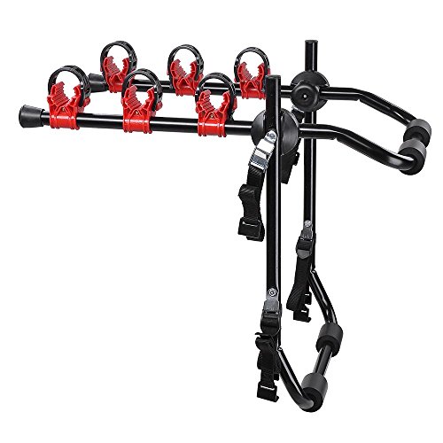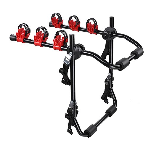 - Sturdy foldable construction, great capacity, can hold 3 bikes - Individual tie-down system secures your bicycles - With straps to deliver exceptional stability for the rack on your vehicle - Easy to install and to remove, adjustable angle to suit the rear radian - Fits most sedans, hatchbacks, minivans, and SUV(without spare tire)