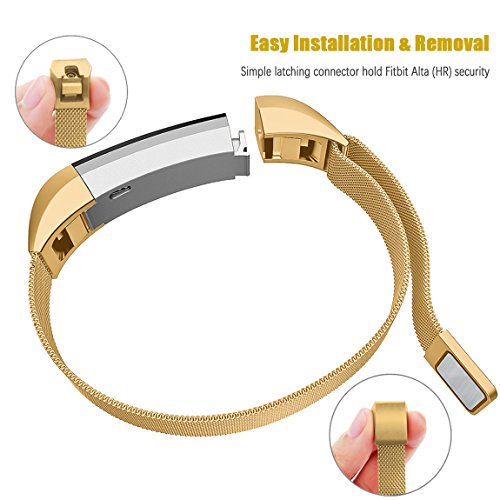 -. Feature : Watch Band Only: The Fitbit Alta and Alta HR Tracker is not included / Perfect Material: Made of premium quality stainless steel, elegant, comfortable and durable / Strong Magnetic Closure: Easy to assemble and resize, holds your band securely.Small size, fits 5.5"-8.5" wrist; Large size, fits 6.1"-9.9" / Precision Metal Connector: Fit seamlessly into your Fitbit Alta and Alta HR interface and make your fitbit stylish and noble. Elevates your style for every occasion / One year warranty: Hassle free replacement or money back during the warranty