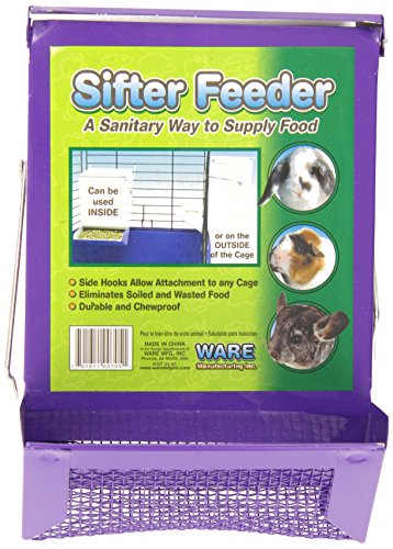 -. Binding : Misc. -. Brand : Ware -. EAN : 0791611007051 -. Feature : All metal powder coated sifter feeder with lid / Attaches easily to any cage / Provides up to 5 days of food / Reduces wasted food and keeps cage cleaner -. IsAutographed : 0 -. IsMemorabilia : 0 -. Label : Ware Manufacturing Inc. -. Manufacturer : Ware Manufacturing Inc. -. Model : 705 -. MPN : 705 -. NumberOfItems : 1 -. PackageQuantity : 1 -. PartNumber : 705 -. ProductGroup : Pet Products -. ProductTypeName : PET_SUPPLIES -. Publisher : Ware Manufacturing Inc. -. Size : 5 INCHES -. Studio : Ware Manufacturing Inc. -. Title : Ware Manufacturing Sifter Pet Feeder with Lid, 5-Inch -. UPC : 791611007051 Our all metal powder coated chew proof sifter feeder with lid easily hangs on any cage. The sifter feeder reduces wasted food and helps keep the cage clean. It provides up to 5 days of food. Available in a variety of colors. Measures 5-inch width by 6-3/4-inch depth by 7-1/4-inch height.