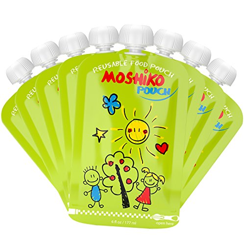 Reusable Food Pouch by Moshiko - Large 6oz. capacity (8-Pack) Perfect for Homemade, Wholesome, and Organic Baby Food - Suitable for Babies, Toddlers and Kids of All Ages - Refillable, Double Zipper, Easy to Clean, Freezable, BPA Free