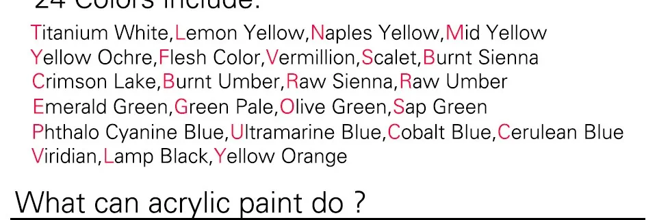 Colors:Titanium White,Lemon Yellow,Naples Yellow,Mid Yellow,Yellow Ochre,Flesh Color,Vermillion,Scalet,