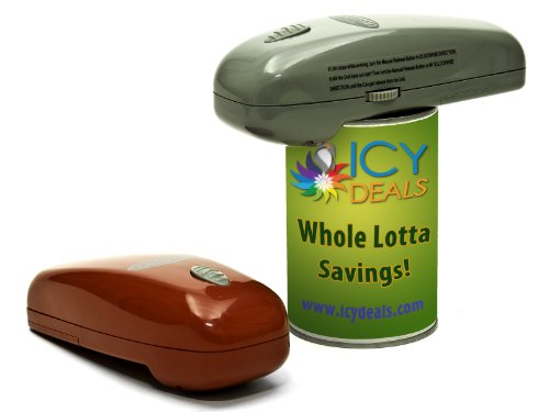 -. Feature : Handy can opener with a new design makes kitchen tasks easier / This handy tool slices through cans with ease; Easy to grip and use / Available in colors Black, Blue, Red and Grey / No sharp edges; Easy to glide on the cans / Powered by 2 AA batteries. This is an one touch can opener so you just need to place the can opener on top of the can and do not hold it. After it is placed on top of the can, just press the start button and do not touch to can or can opener.