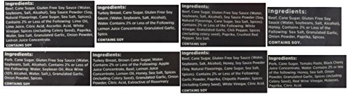 Assortment includes one 2.7-ounce bag of each flavor: Beef Jerky in Chili Lime, Garlic Chili Pepper, Sea Salt, Sweet Chipotle; Pork Jerky in Black Cherry BBQ, Garlic Sweet Teriyaki; Turkey Jerky in Basil Citrus, Lemon Garlic.