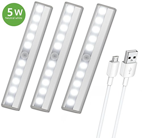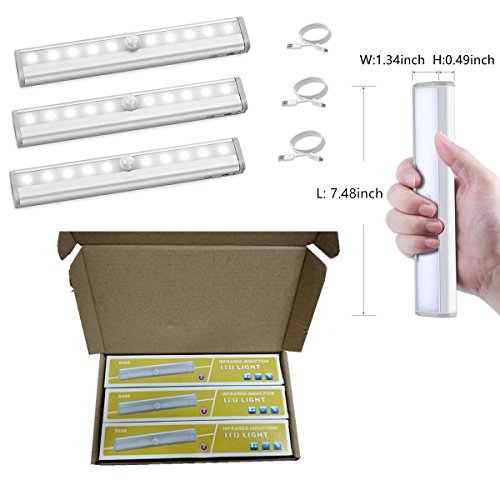 Motion Sensing Closet Light (USB Rechargeable) DIY Stick-on Anywhere Portable 10-LED Under Cabinet Light Under-Bed Night Light Stair Step Light With Magnetic Strip, Puck Lights - 3 Packs, Daylight