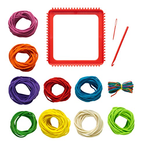 Comes with plastic loom, 182 loops in 9 colors, 6 yards of rainbow-colored yarn, plastic yarn needle, plastic crochet hook