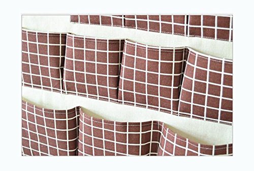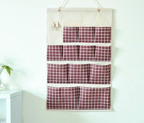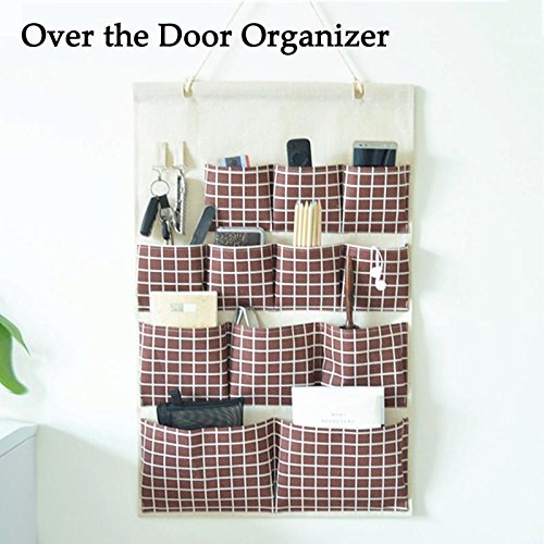 Xsorter Over the Door Organizer, Eco-friendly Wall-mountable Closet Hanging Storage Bag, 12 Pockets Linen Bag Case for Office & Home Wall Door Closet, Wooden Rod Included, Creamy with Brown Red Grids
