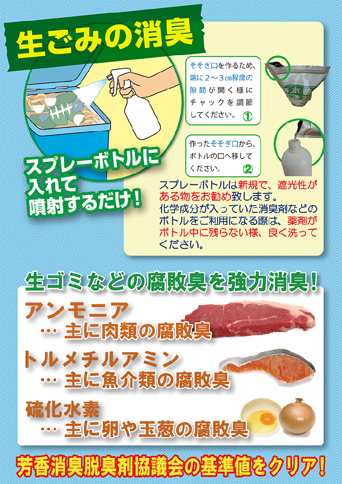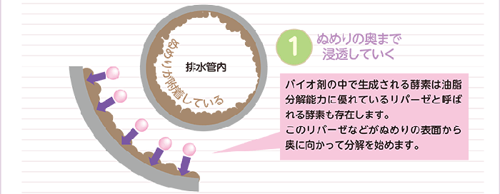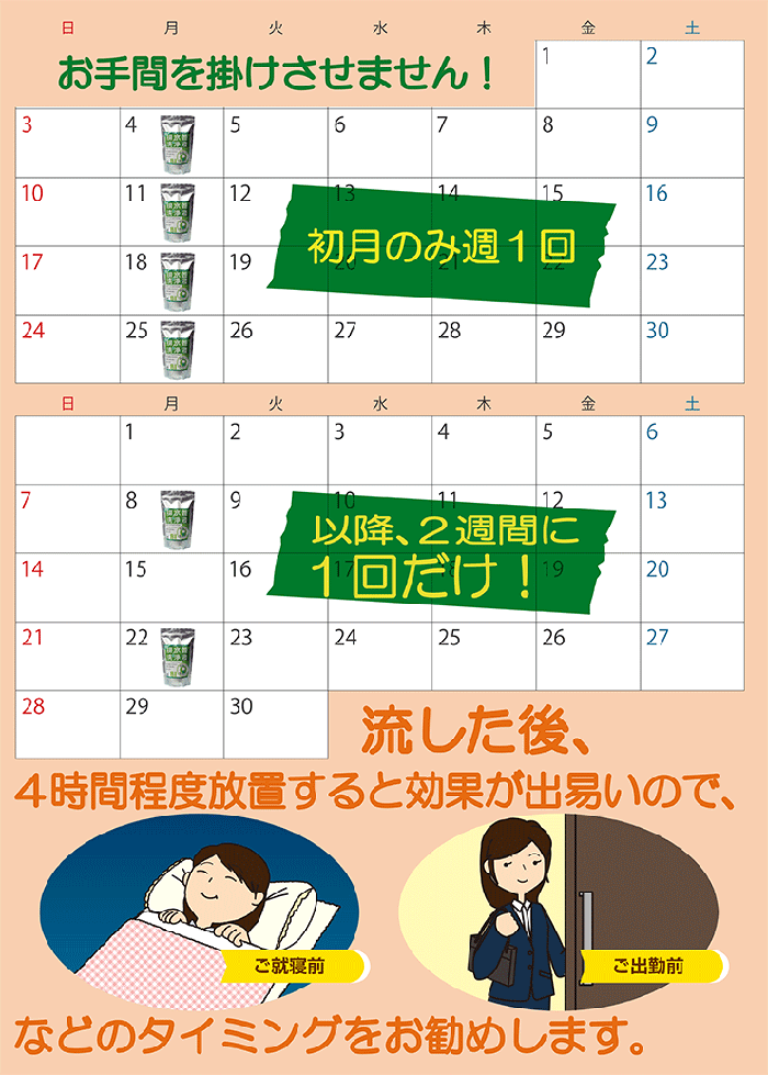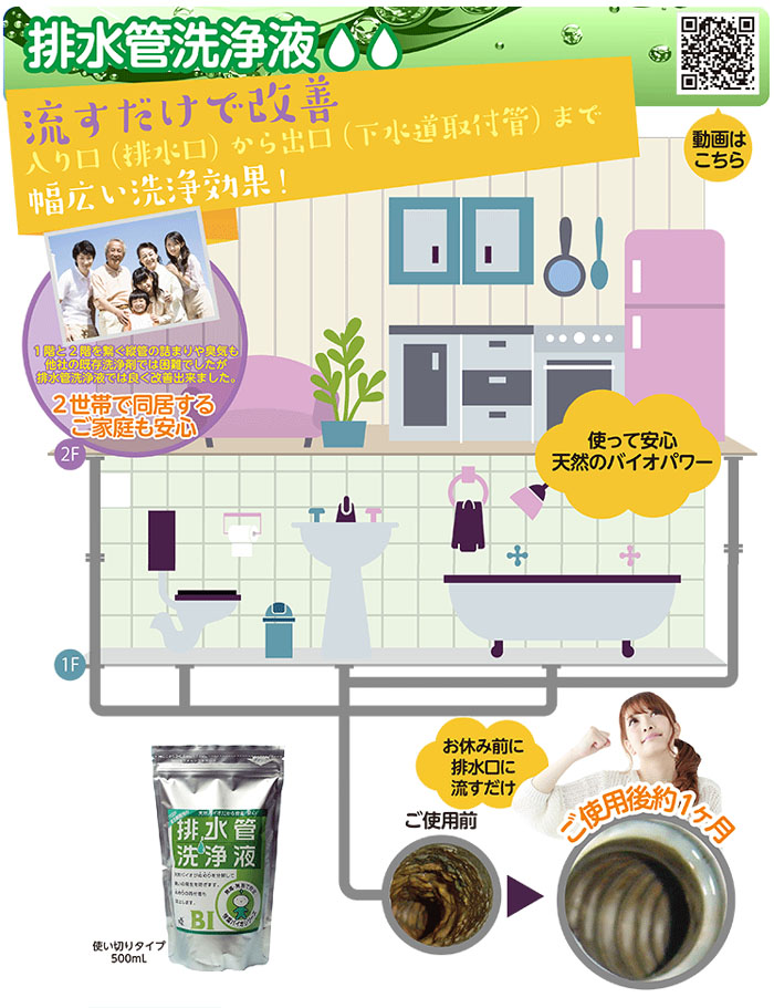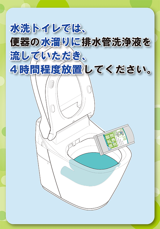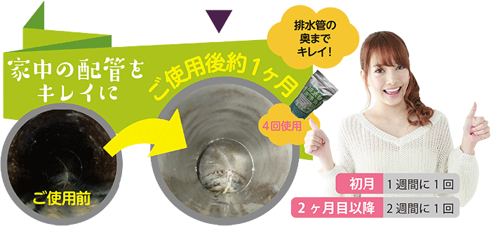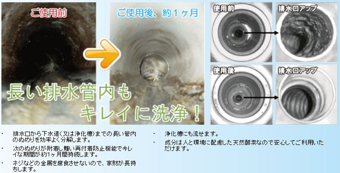 | ご使用方法 | 初月は1週間に1度500mL程度を、2ヶ月目からは2週間に1度500mL程度を臭いや詰まりが気になる排水口に流してください。 流した後、4時間程度排水を流さない方が効果が得られ易くなりますので、ご就寝前やご出勤前などでの、ご使用をお勧め致します。 |