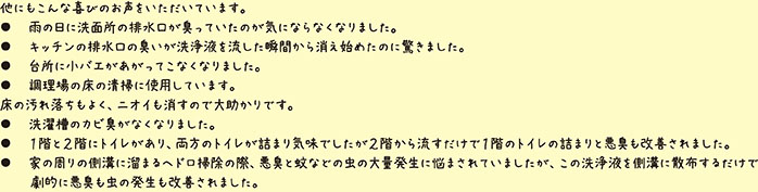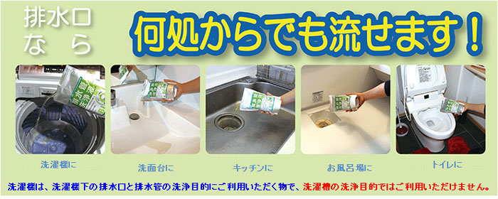 | ご利用場所 | ■キッチンの排水口 ■洗濯機の排水口 ■お風呂の排水口 ■水洗トイレなど、排水口なら何処でも |