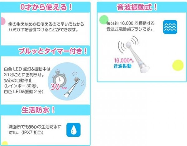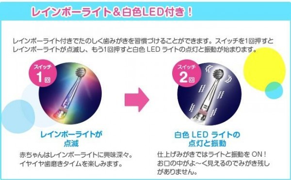 | 0歳から始める電動歯ブラシ♪レインボーに光るLEDライトが搭載されており、楽しく歯みがきを習慣づけることができます。洗面所でも安心の生活防水対応! |