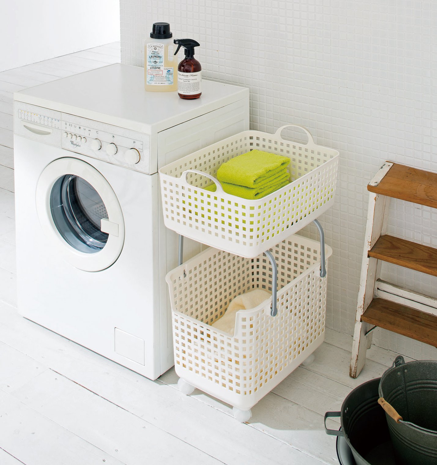A laundry basket that can be used in 2 stages, 3 stages, etc. next to the washing machine