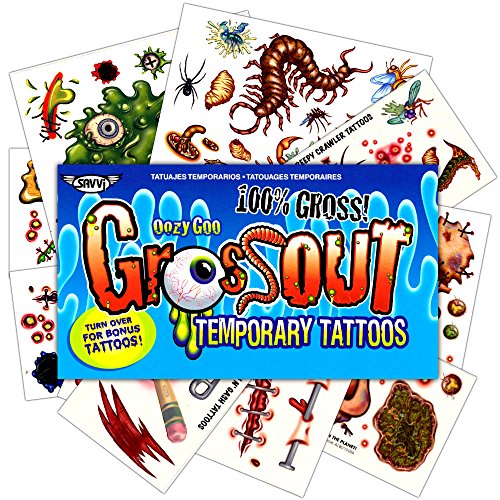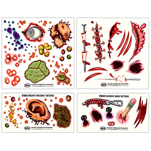 -. Feature : Ultimate Zombie Temporary Tattoos Costume Pack for Kids and Adults. 80 gross slash, scar and wound tattoos. / This zombie pack includes everything you need to complete your zombie costume or Walking Dead costume. / A total of 80 wound temporary tattoos -- slashes, scars, open wounds, gashes, stitches and more. Halloween wound temporary tattoos are easier to apply and remove than wound and scar make-up kits. FD& C approved ingredients. Made in the USA. / These long lasting slash, scar and wound tattoos are perfect as Halloween and zombie party favors and Walking Dead party supplies. Also great for Halloween party supplies, party favors, costumes and more! / Perfect for zombie conventions and zombie costumes for adults and kids alike. The ultimate zombie injury and wound tattoo set!