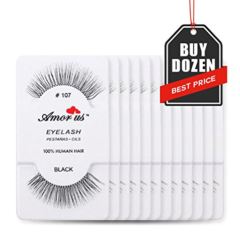 Amorus 12 Pairs Multipack #107 False Eyelashes Dozen Set 100% Natural Hair Black Handmade Comfortable Reusable Fake Lashes Pack