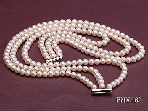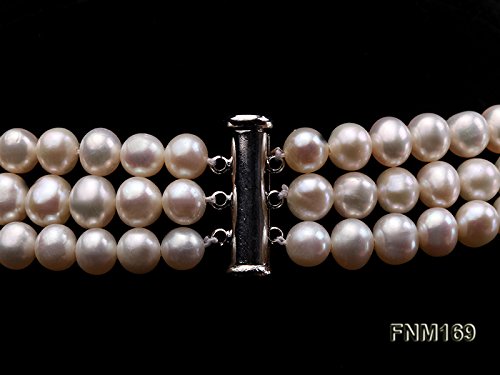 This gorgeous necklace is strung with white flat round 6-7mm freshwater pearl beads.