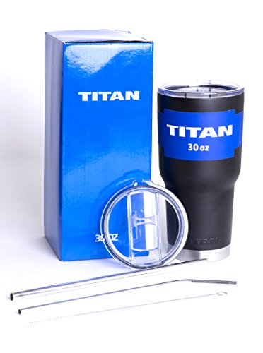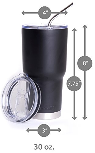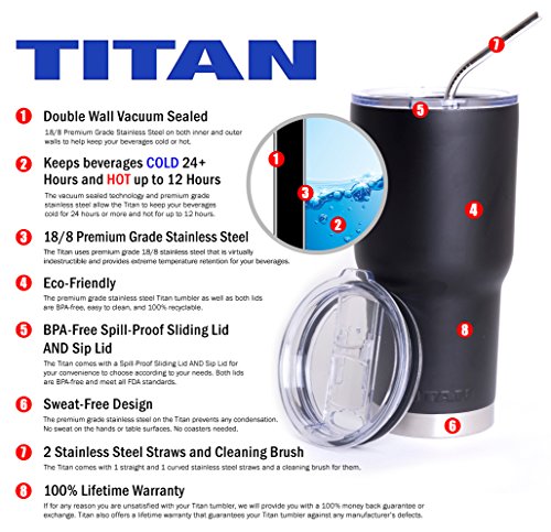 TITAN UP! The Titan is the industry standard of stainless steel tumblers. Made with quality craftsmanship of premium kitchen grade double walled vacuum sealed 18/8 stainless steel, the Titan is designed for maximum efficiency of ice retention, allowing beverages to remain cold and warm longer than other tumblers. The Titan leaves absolutely no condensation so your tumbler doesn't sweat on your hands and there's no need for coasters. It fits perfectly in most car cup holders and is perfect for travel to work, camping, any outdoor activities, and everyday use at home. So what are you waiting for? TITAN UP!Feature