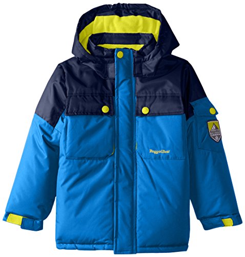Color-blocked cold-weather jacket featuring polar fleece lining, snap-close storm gator closure at inside waist, and hood with hook-and-loop face shield Zip-front closure with covered placket Side entry hand pockets and snap-flap patch pockets at chest and sleeve Polyester fill Brand : Rugged Bear EAN : 0887310373266 Product Dimensions(LxWxH) :