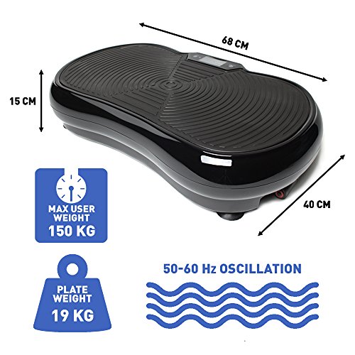 Lieferumfang: Vibrationsplatte, Kabel, Fernbedienung, Trainingsposter, Anleitung