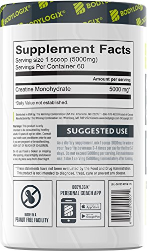Bodylogix Creatine delivers 5000mg of non-GMO, pure micronized creatine monohydrate, a nutrient shown to increase peak power output and muscular performance in high intensity resistance training, while improving lean muscle. Bodylogix Creatine is micronized for improved solubility and rapid absorption.