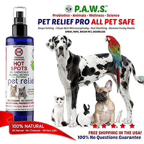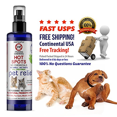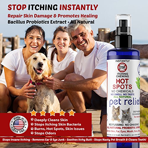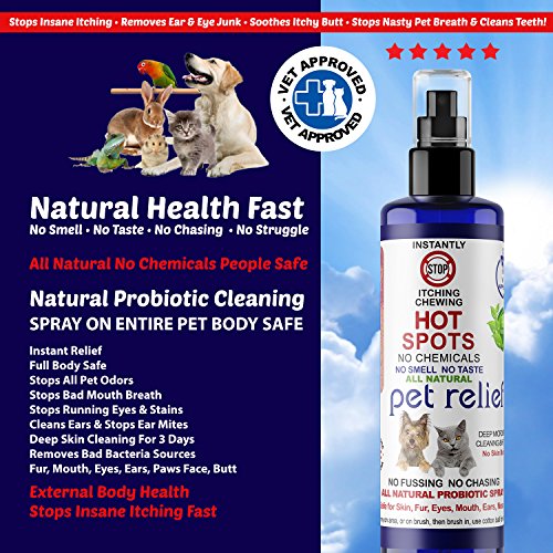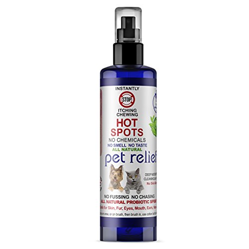-. Feature : Instant Hot Spot Dog Stop Itching Spray! Safe for Eyes, Ears, Nose, and Bad Dog Breath simply by spraying in the water bowl. Cleans and Repairs Skin to grow back healthy fur. All Natural NO CHEMICALS, NO STINGING, NO BAD SMELLS! Use on Dogs Cats Birds and People. Free Shipping, Two 4oz bottles. Instant Cooling Soothing European Probiotics. Stops Biting. Stops Scratching, Stop Itching, provides Pet Relief natural stop itching spray. / Soothing Cooling Skin Repair & Stop Itching Spray. Stop Chewing of the paws on contact! / No Sting, No Smell, No Burning, Spray area and leave on / Probiotic extracts works for 7 days and deep cleans and heals skin / Promotes Fur Growth and Repair