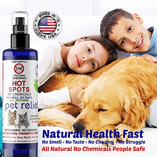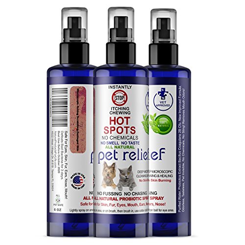 -. Title : Natural Dog Cat Pet Stop Itching Spray-6 oz Bottle! Pet Relief Dog Stop Itching Spray. Cooling Soothing, No Chemicals, all natural stops itching on contact for dogs, cats, birds, and humans.