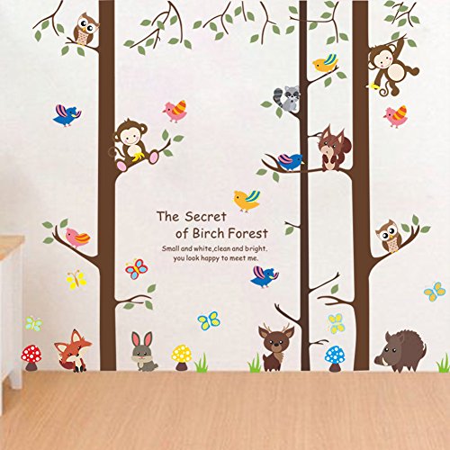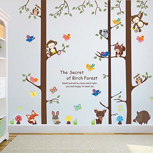 Cartoon Forest Giant Brown Tree Animals Owl Bird Fox Monkey Wall Stickers Wall Decal Vinyl Removable Art Wall Decals for Girls and Boys Nursery Room Children's Bedroom