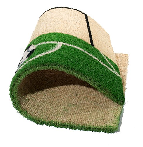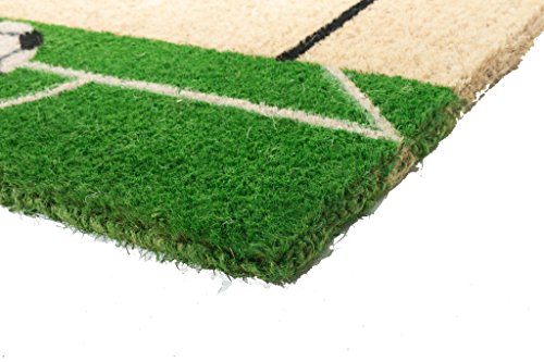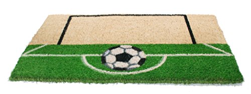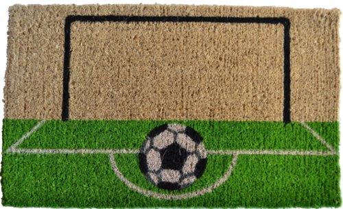 Soccer players and soccer fans will love the soccer-inspired theme of this doormat depicting a soccer ball and goal. stenciled with fade-resistant dyes in green, white and black. imports décor constructs their doormats with the best quality coir naturally bleached with sea water. coir is the natural fibre extracted from the husk of coconuts. coir fibre is relatively waterproof, has superior scrubbing power and is resistent to the elements. with a coir doormat from imports decor, you can feel confident dirt and debris will be left at the front door and not in your home. item 171scm.Feature
