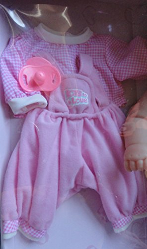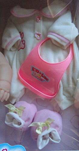 Product DescriptionIncludes: 1 14" Soft Vinyl Doll 1 outfit (Shirt and bottoms) 1 Pajama 1 Pair of slipper 1 diaper 4 pacifier 1 bib0
