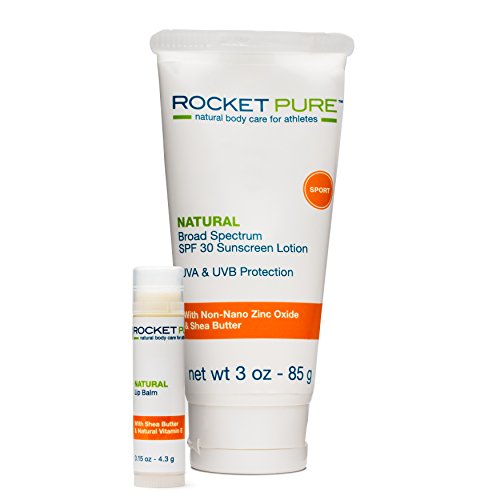 ROCKET PURE NATURAL 3 OZ SPF 30 SUNSCREEN AND LIPBALM COMBO PACK. BROAD SPECTRUM UVA & UVB PROTECTION, NON-NANO ZINC. "WHITE HOT SUNSCREEN WITH ZINC OXIDE" BY ROCKET PURE. (Combo) •