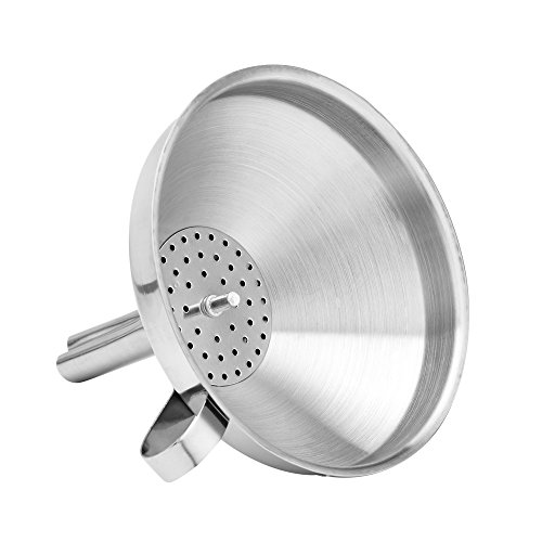 - FUNNEL WITH STRAINER - A detachable strainer is also included in order to filter solid from liquids just like that. Just place the strainer in the funnel during the filtering process and get ready to be amazed. A small yet might tool for filtering larger solids as wellnow there's nothing you can’t filter!