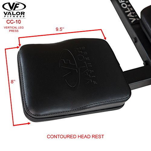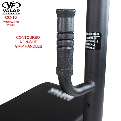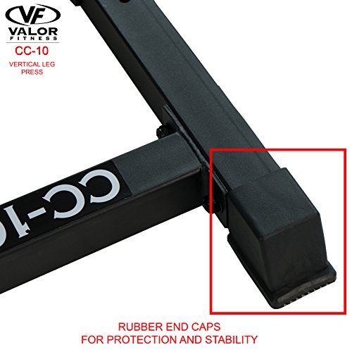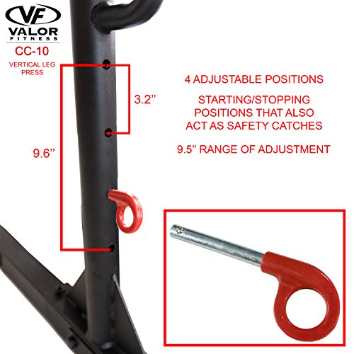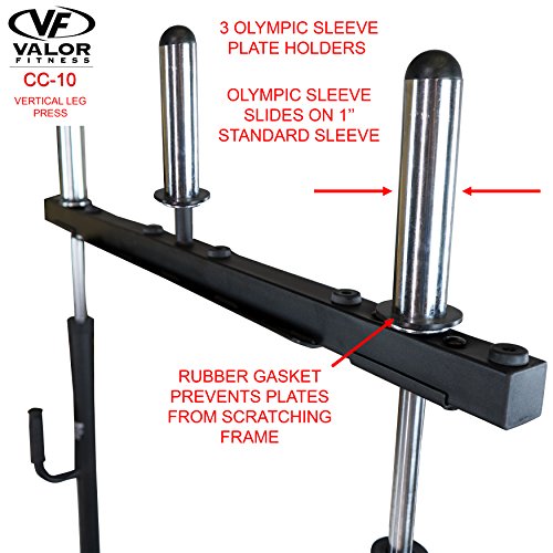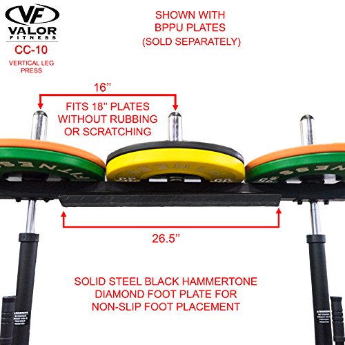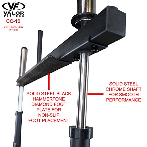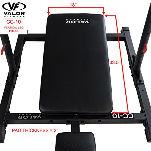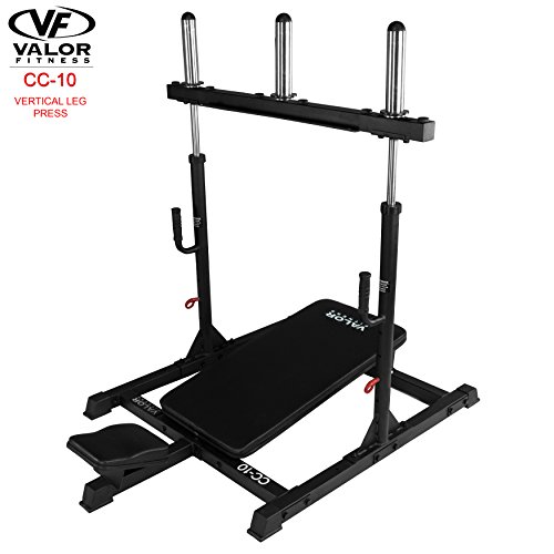 Studio : Valor Fitness Publisher : Valor Fitness Binding : Misc. Product Description The Valor Fitness CC-10 Vertical Leg Press is an adjustable compact leg press that features a unique vertical design that not only provides exceptional support for your back and hips, but also minimizes the amount of space it takes up in your home gym or commercial gym setting. Constructed using 2"x2" heavy-duty steel gauge tubing, the uprights can withstand up to 500lbs of added weight. High-quality bearings glide smoothly over the solid steel upright carriages during your workout. Two contoured handles aid in entering and exiting the unit. While laying comfortably on a 2" thick, double reinforced back cushion (33.5" x 18"), and a 15 degree angled contoured head cushion (9.5" x 8) your leg press workout has the support needed to ensure stability. Four variable height positions(9.6" range) and two hook style safety catch popper pins allows versatility and assurance during your exercises . The 26.5" solid steel black hammertone coated diamond foot plate ensures proper footing while lifting. The CC-10 also offers three 1" diameter plate posts with rubber stoppers that can comfortably fit three 18" bumper plates side by side without rubbing or scratching. Three Olympic size sleeve adaptors with rubber gaskets are also included. Four rubber end caps for added stability. Warrabty: 3 Year Frame, 2 Year Pad, 1 Year Popper Pin. Assembly Instruction Included: Yes. Assembly Tools Included: No 0