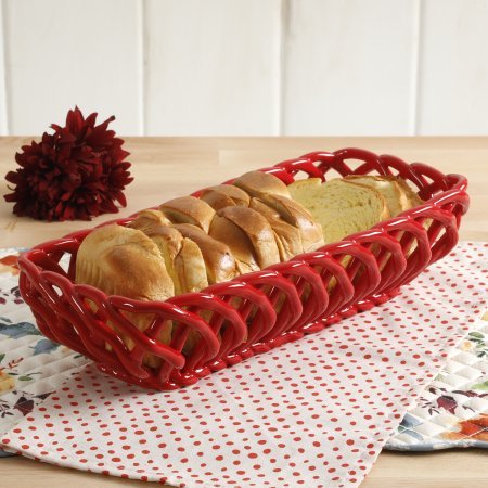 Product Description The Pioneer Woman 13.7Inch Timeless Beauty Bread Basket is perfect for use from oven to table. This intricately woven stoneware bread basket is great for warming up bread or appetizers right before serving your friends and family, and is available in linen, turquoise and red. The timeless beauty bread basket is handmade and makes a wonderful hostess gift. It is dishwasher and microwave safe. 0