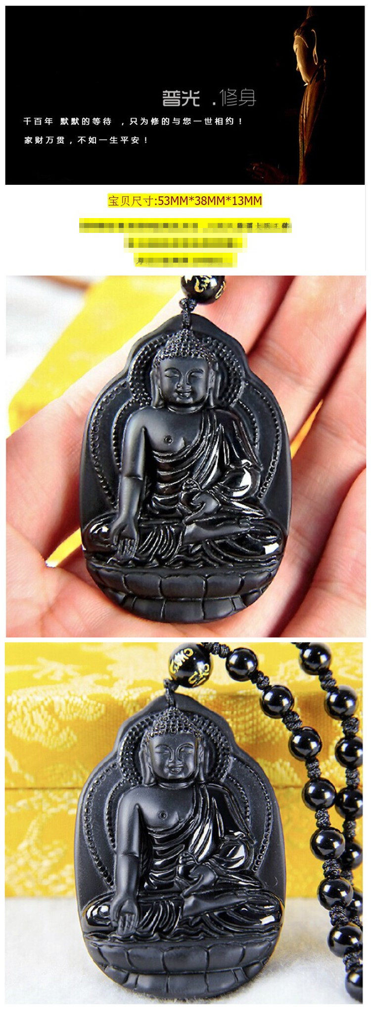 开光黑曜石磨砂款药师佛吊坠男女挂件菩萨佛牌项链