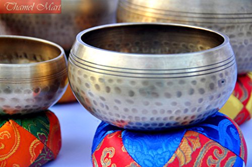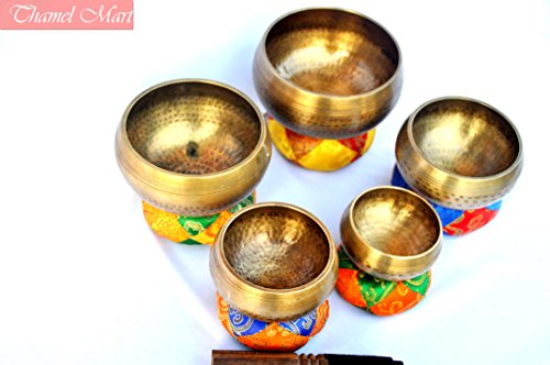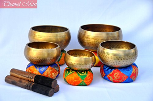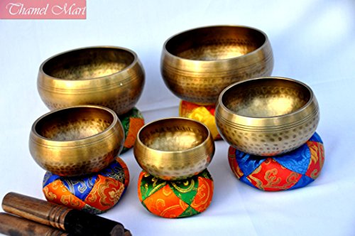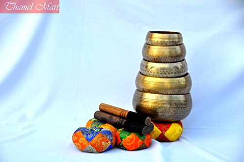 Studio : thamelmart Publisher : thamelmart Product Description This is a set of five gorgeous hand beaten singing bowls. These singing bowls are between 3" to 5.2" in diameter and weight 2500 gms together. These bowls sing very easily and produce rich, harmonic and soothing sound that lasts for long duration. Together they produce energetic and vibrating sounds which provided stress free relaxation. These singing bowls has been used for meditation, music, relaxation, personal well being, healing energy and chakra creation etc. for generations. They are used by a wide range of professionals, including health professionals, school teachers, musicians and spiritual teachers. Singing bowls are used in health care by psychotherapists, massage therapists, cancer, and stress and meditation specialists. They are used to help treat cancer patients and also for post-traumatic stress disorder. They are popular in classrooms to help facilitate group activities and focus students' attention. This singing bowls were hand-crafted in Nepal. This singing set includes five hand beaten singing bowls and five strikers and Five silk cushions. The sound of singing bowls can have a healing result on an individual, and can be used therapeutically. This is an introduction to singing bowls connected to the major chakras based on the Buddhist Tantric System. Chakras can be referred to as 'power engines', or 'energy facilities' of the body. There are lots of different chakras and practices pertaining to them. Each chakra has distinct components and corresponds with a certain tone of the musical scale and an unique shade. The notes of the bowls correspond with each of the significant chakras. Keeping these facilities in harmony causes wellness and harmony. The lower chakras, situated lower than the diaphragm are connected to the physical or survival world. Specification of Bowl : This is handcrafted bowl therefore please note that each one might have slight variations in measurement. Metrials : Brass and Seven auspicious metals. 0