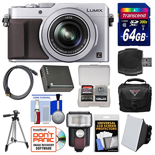 Panasonic Lumix DMC-LX100 4K Wi-Fi Digital Camera (Silver) with 64GB Card + Case + Flash & Soft Box + Battery + Tripod + Kit
