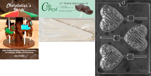 Cybrtrayd Lattice Heart with Flowers Lolly Valentine Chocolate Candy Mold with 50 4.5-Inch Cybrtrayd Lollipop Sticks and Chocolatier's Guide