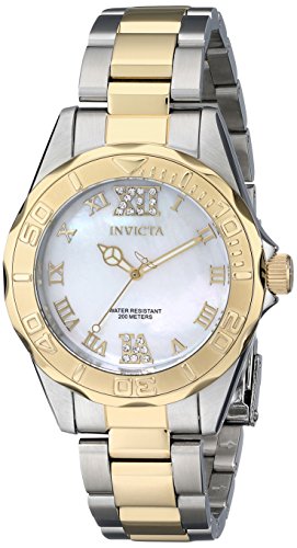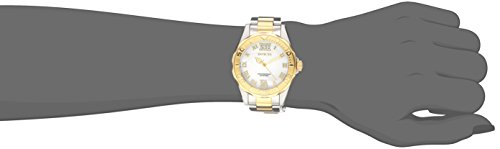 Gold-plated stainless steel case with a two-tone (silver and gold-plated) stainless steel bracelet. Fixed gold-plated bezel. Mother of pearl dial with luminous gold-tone hands and Roman numeral hour markers. Dial Type: Analog. Luminescent hands. Quartz movement. Scratch resistant mineral crystal. Pull / push crown. Solid case back. Case diameter: 38 mm. Round case shape. Band width: 18 mm. Band length: 7.85 inches. Fold over clasp with safety release. Water resistant at 200 meters / 660 feet. Functions: hour, minute, second. Casual watch style. Invicta Pro Diver Mother of Pearl Dial Two-tone Ladies Watch 17871.Feature