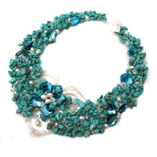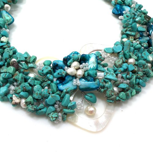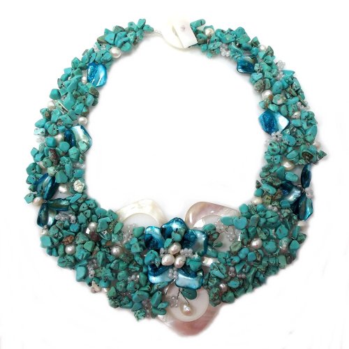 Cascades of simulated turquoise stones evoke feminine elegance. This bib necklace features a floral design made of mother of pearl and cultured freshwater white pearl. PLEASE NOTE: The handcrafted nature of this product will produce minor differences in design, sizing and weight. Variations will occur from piece to piece, measurements may vary slightly.Includes an original AERAVIDA organza jewelry pouch (comes in various colors), also handmade by our Artisans. Perfect for gift giving to someone special or keep for yourself!