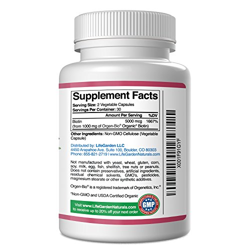100% Satisfaction Happiness Guarantee Our Whole Food Biotin is produced in the USA with the best ingredients in an FDA registered and cGMP compliant facility. LifeGarden Naturals uses absolutely NO preservatives, artificial ingredients, residual chemical solvents, GMO's, pesticides, magnesium stearate or other chemical additives.