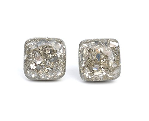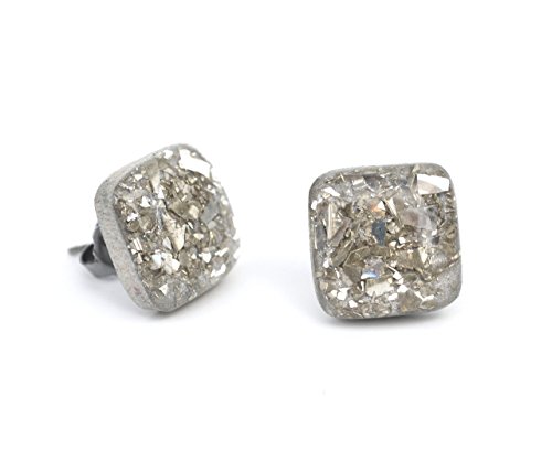 -. Title : Glass glitter square studs earrings. Reclaimed wood jewelry by Starlight Woods. Hypoallergenic.