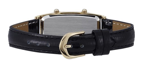 - Elegant highly polished tonneau gold-tone timepiece with rich croco grain black leather strap