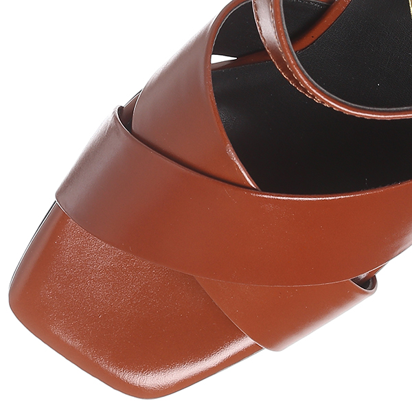 은은한 광택의 고급 소가죽을 사용한 신규 모던라인의 샌들. X스트랩은 발볼을 안정적으로 감싸주고, 청키한 굽은 발목의 흔들림 없이 착화가 안정적임. 버클 안쪽의 탄력밴드가 있어 신고 벗기 편함.