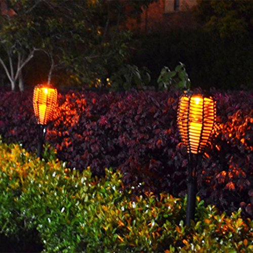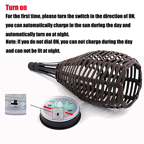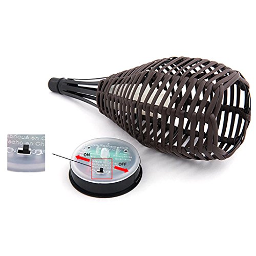 -. Feature : Dusk to Dawn Sensor, charge by day and automatically turn on the LED at dusk. / Material: Plastic / Light source: LED with plastic simulation candle shellLight color: Yellow / Pattern: Rattan weaveSwitch: On/Off Switch / Application: For Parks, Gardens, Villas, Lawn, Pathway etc.