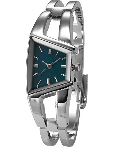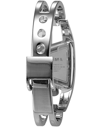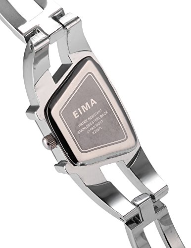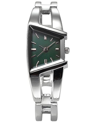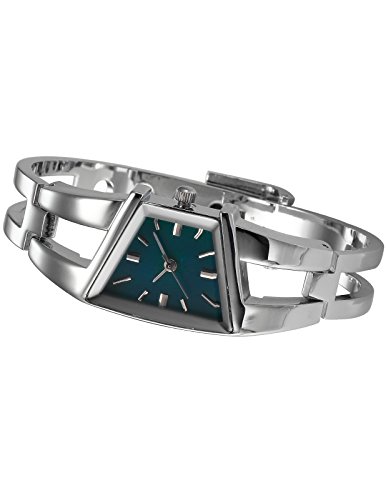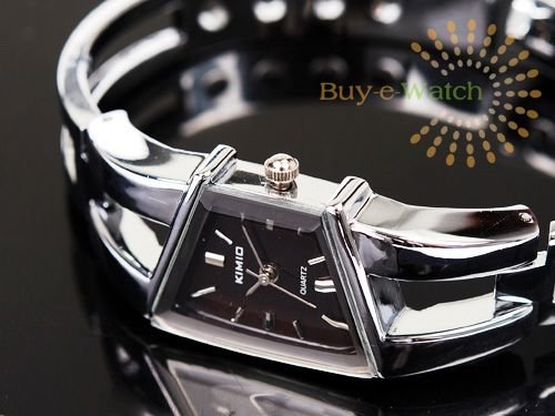Unique trapezia case. Sleek silver color dress bangle watch. Black dial adds elegance to this women's art timepice. Special adjustable buckle design