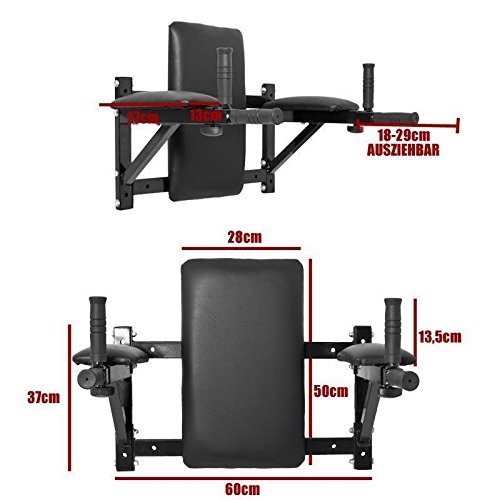 -. Feature : Beinhebestation - für ein effektives, gezieltes Bauchtraining / optimale Passform der Polsterung mit Haltegriffen / Dipstation: Brust-, Schulter-, und Trizepsmuskulatur / max Belastbarkeit 200 Kg / Farbe: schwarz / Maße: siehe Artikelbild / Lieferumfang: 16x Schrauben, Muttern und Unterlegscheiben (Dübel zur Befestigung an der Wand sind nicht im Lieferumfang enthalten)