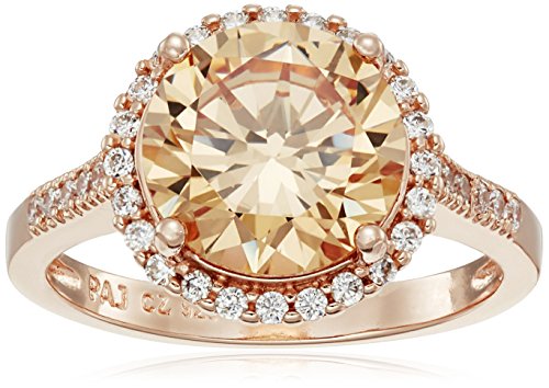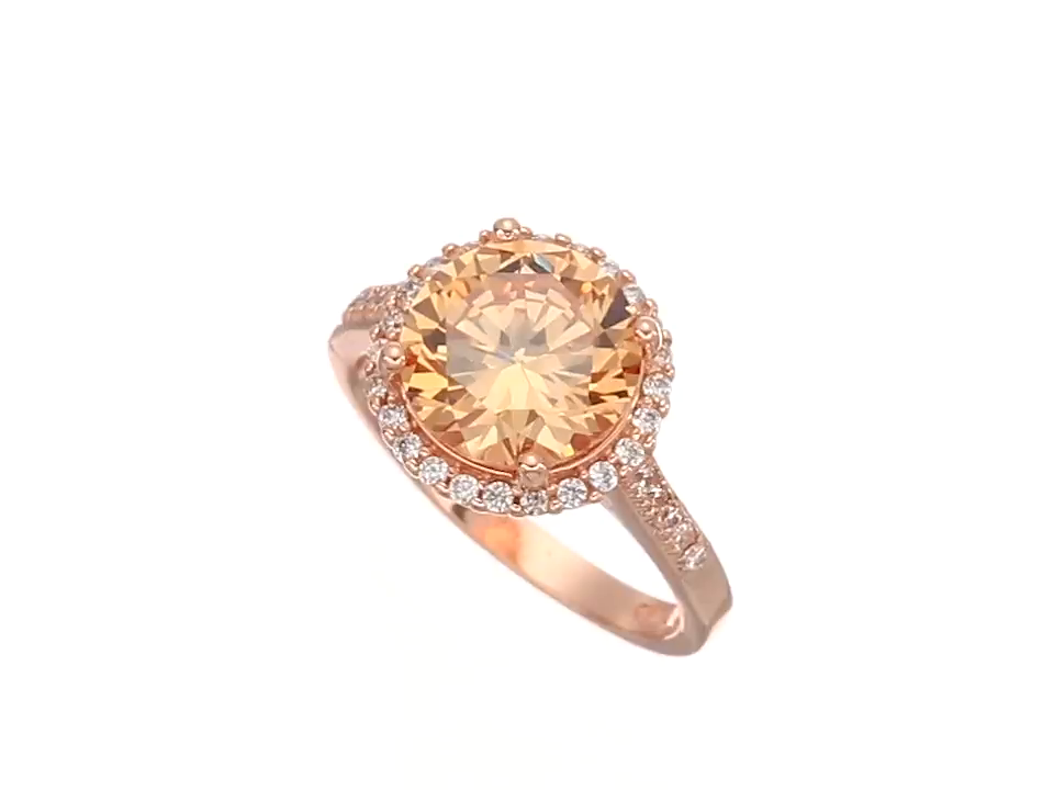 Rose gold plated sterling silver ring featuring round cut 10mm Champagne Cubic Zirconia center stone adorned in halo setting with white (clear) Cubic Zirconia stones