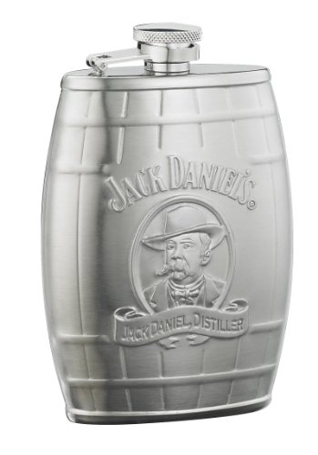- Stainless steel Jack Daniel's Cameo barrel shaped flask with satin finish and captive top